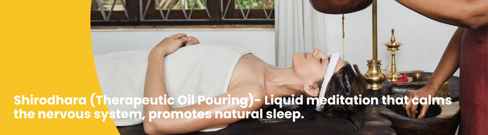 Meaning: The continuous pouring of medicated liquid over the head induces sound sleep, calms the mind, brings relaxation, and alleviates various disorders.